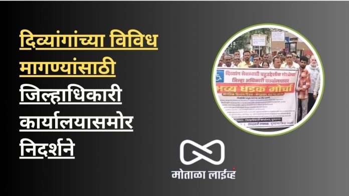 (मोताळा लाईव्ह ) आज जागतिक दिव्यांग दिनानिमित्त दिव्यांग बांधवांनी त्यांच्या विविध मागण्यांसाठी बुलढाणा जिल्हाधिकारी कार्यालयासमोर निदर्शने केली आहेत. आंध्रप्रदेश मध्ये ज्याप्रमाणे तेथील मुख्यमंत्र्यांनी दिव्यांग बांधवांना सहा हजार रुपये लागू केले आहे त्याचप्रमाणे महाराष्ट्र सरकारने देखील सहा हजार रुपये लागू करावे, जिल्हा दिव्यांगाची टक्केवारी न लावता सरसकट किमान 40% दिव्यांग असलेल्या व्यक्तींना संबंधित संस्थांच्या स्व उत्पन्नातून पाच टक्के निधी वाटप करण्याचे सक्त निर्देश देण्यात यावे यासह अन्य मागण्यांसाठी दिव्यांग बांधवांनी निदर्शने करत आपल्या मागण्या तात्काळ मान्य कराव्या अशी विनंती केली आहे.
