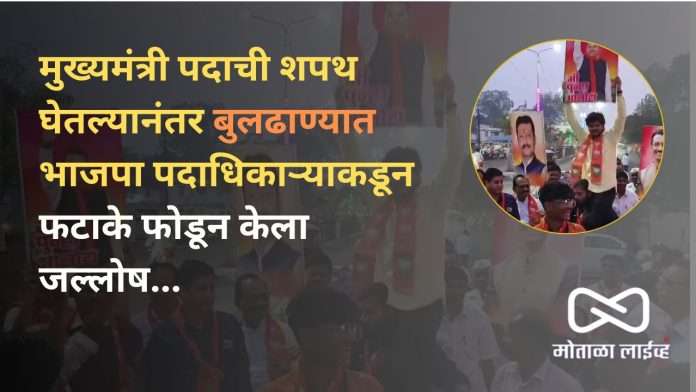 ( मोताळा लाईव्ह ) राज्याच्या विधानसभा निवडणुकीत काळजीवाहू मुख्यमंत्री एकनाथ शिंदे यांच्या नेतृत्वात निवडणुकीत एक हाती सत्ता मिळाल्यानंतर आज देशाचे पंतप्रधान नरेंद्र मोदी, गृहमंत्री अमित शहा यांच्या उपस्थितीत मुंबई येथील आझाद मैदानावर राज्याचे मुख्यमंत्री म्हणून देवेंद्र फडणवीस आणि उपमुख्यमंत्री म्हणून एकनाथ शिंदे अजित पवार यांनी शपथ घेतली आहे.. या शपथविधीचा सोहळा शहरातील नागरिकांनी पहावा यासाठी स्क्रीन देखील लावण्यात आल्या होत्या.. तर शपथविधीनंतर ढोल ताशाच्या गजरात भाजपा पदाधिकाऱ्यांनी एकमेकांना पेढे भरवत देवेंद्र फडणवीस यांचे कट आउट हातात घेत फटाके फोडत जल्लोष साजरा केला आहे..