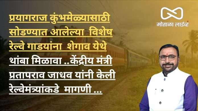 (मोताळा लाईव्ह ) प्रयागराज येथील कुंभमेळाव्यासाठी सोडण्यात आलेल्या विशेष रेल्वे गाडयांना शेगाव रेल्वे स्थानकावर ही थांबा मिळावा अशी मागणी केंद्रीयमंत्री प्रतापराव जाधव यांनी रेल्वेमंत्री अश्विनी वैष्णव यांच्याकडे केली आहे उत्तर प्रदेशातील प्रयाग राज येथे 13 जानेवारीपासून कुंभमेळाला सुरुवात झाली आहे बारा वर्षानंतर येणाऱ्या या कुंभमेळाव्यात देशभरातील भाविकांना सहभागी होता यावे यादृष्टीकोनातून केंद्र सरकारच्यावतीने विशेष रेल्वे गाड्या ही सोडण्यात आल्या आहे यामध्ये हुजूर साहेब नांदेड पटना कुंभमेळा एक्सप्रेस,,काचीगुडा पटना कुंभमेळा एक्सप्रेस आणि पटना सिकंदराबाद कुंभमेळा एक्सप्रेस ह्याचा समावेश आहे ह्या विशष रेल्वे गाड्या माझ्या बुलढाणा लोकसभा मतदारसंघातून जात आहे परंतु या गाड्यांना शेगाव येथे थांबा नाही . संत गजानन महाराजांचे समाधीस्थळ शेगाव येथे आहे संतनगरी शेगाव येथे देशभरातून लाखो भाविक येत असतात भक्तांची मांदियाळी या ठिकाणी दररोज दिसून येते कुंभमेळा विशेष रेल्वे गाड्यांना शेगाव येथे थांबा दिल्यास भक्तांना शेगाव येथील गजानन महाराजांच्या समाधीस्थळचे दर्शन घेण्याची संधी मिळेल आणि बुलढाणा जिल्ह्यातील भक्तांनाही प्रयागराज येथील कुंभमेळा येथे जाण्यासाठी सुविधा उपलब्ध होईल त्या दृष्टिकोनातून शेगाव रेल्वे स्टेशनवर उपरोक्त तिन्हीही कुंभमेळा विशेष रेल्वेला थांबा द्यावा अशी मागणी केंद्रीय आरोग्य व कुटुंब कल्याण राज्यमंत्री प्रतापराव जाधव यांनी केंद्रीय रेल्वेमंत्री अश्विन वैष्णव यांच्याकडे एका पत्राद्वारे केली आहे