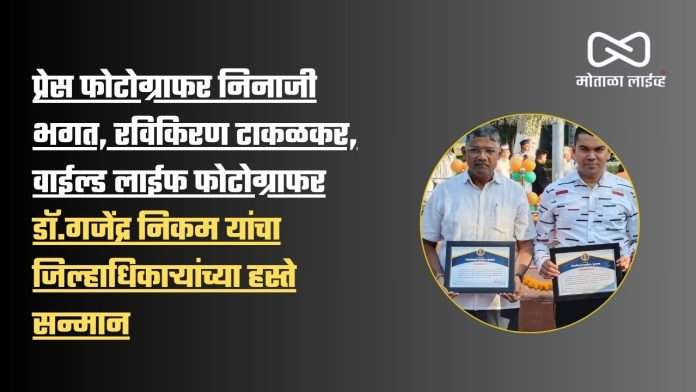 {मोताळा लाईव्ह } जिल्हाधिकारी डॉ. किरण पाटील यांच्या संकल्पनेतून संपादित केलेल्या मातृतीर्थ बुलढाणा या कॅाफी टेबल बुक निर्मितीमधील योगदानासाठी बुलढाण्यातील प्रेस फोटोग्राफर निनाजी भगत, रविकिरण टाकळकर, वाईल्ड लाईफ फोटोग्राफर डॉ. गजेंद्र निकम यांचा जिल्हाधिकाऱ्यांच्या हस्ते प्रशस्तीपत्र देवून प्रजासत्ताक दिनी सन्मान करण्यात आला.