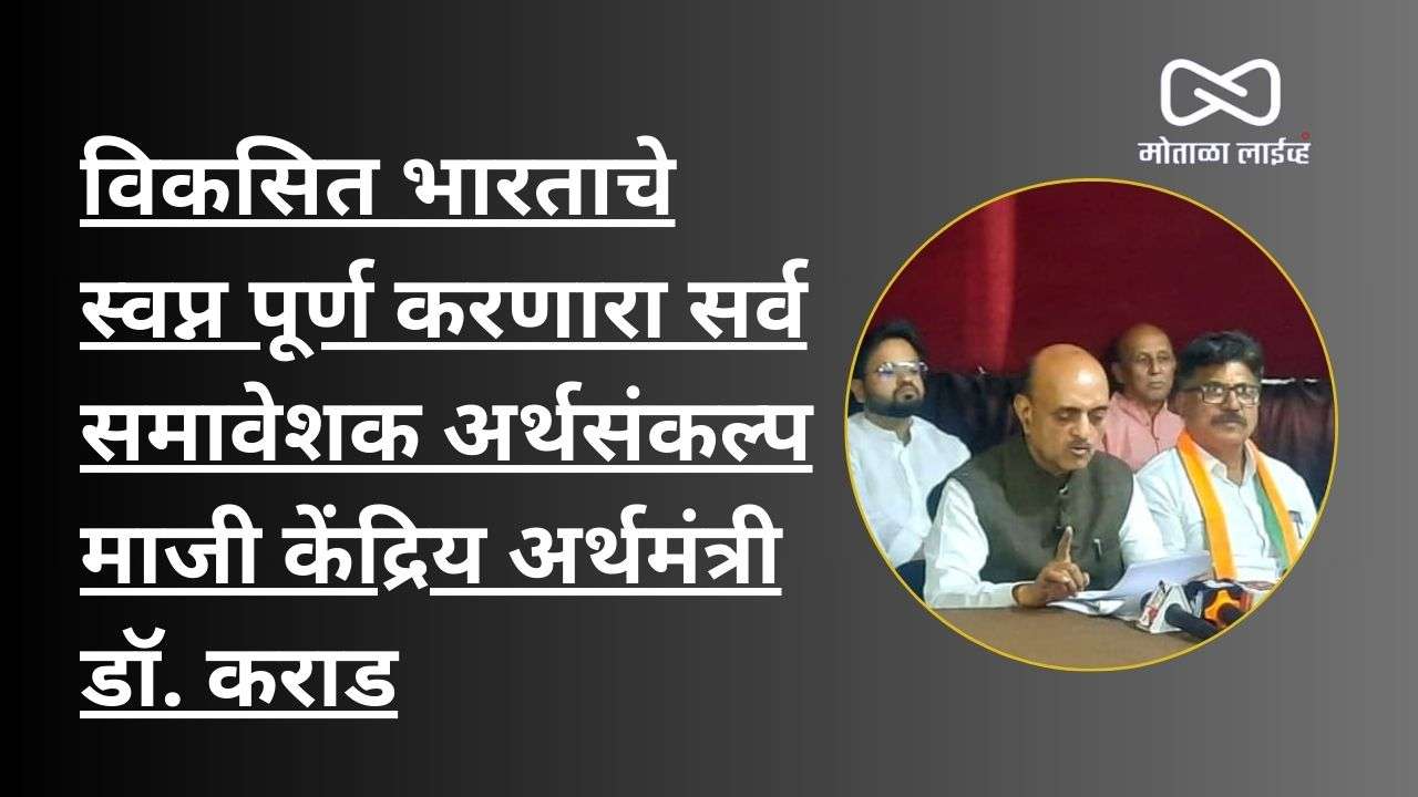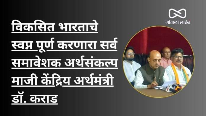 [मोताळा लाईव्ह ] :140 कोटी भारतीयांना विकसित भारताचे स्वप्न पूर्ण करण्यासाठी पंतप्रधान नरेंद्र मोदी यांच्या नेतृत्वातून केंद्र सरकारने यावर्षी 50 लाख 65 हजार कोटी रूपयांचा अर्थसंकल्प सादर केला. गेल्या वर्षी 47 लाख 16 हजार कोटी रूपयांचा हाच अर्थसंकल्प होता. 2014 मध्ये पहिल्यांदा नरेंद्र मोदी सरकारने हा अर्थ संकल्प सादर केला तेव्हा साडे सोळा लाख कोटी रूपयांची तरतूद होती. आता 3 पटीने वाढ झाली आहे. तसेच दरवर्षी अपेक्षित उत्पन्नाची वाढ करतांना 26 लाख 96 हजार कोटीची वाढ झाली आहे. येत्या 2047 मध्ये भारताला विकसित राष्ट्र बनविण्याचे स्वप्न साकारल्या जाणार आहे अशी माहिती राज्यसभेचे खासदार माजी केंद्रिय अर्थराज्यमंत्री डॉ. भागवत कराड यांनी पत्रकार परिषदेत दिली आहे.