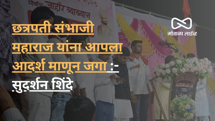 ते पुढे बोलतांना म्हणाले, माझ्या राजाने सुपारीच्या खांडाचे व्यसन केले नाही, पर स्त्री ला मातेसमान मानलं, रयतेच्या रक्षणासाठी जात,पात,धर्म,पंथ बाजूला सारून रयत हीच आपली जात माणून अठरापगड जातीला सोबत घेऊन हिंदवी स्वराज्य निर्माण केलं त्याचा विचार हा आपला जगण्याचा आदर्श असला पाहिजे. आपल्याला वाटत असेल माझ्या पोटी संभाजी राजा जन्माला यावा तर बापाला सिह,आणि आईला जिजाऊ बनावं लागेल तेव्हा आपल्या पोटी छावा जन्माला येईल. वाघाच्या जबळ्यात घालुनी हात मोजती दात अशी जात ही अमुची पहा चाळुनी पाने आमुच्या इतिहासाची संभाजी महारांच्या युद्धनितीत एकही लढाई न हरणारा राजा छत्रपती संभाजी महाराज,वयाच्या न ऊ व्या वर्षी चार ग्रंथ लिहिणारा संभाजी महाराज संस्कृत पंडीत झाला तेवढा अभ्यास करुन आपणंही कलेक्टर आयपीएस सारख्या नोकऱ्या मिळवून संघटीत होऊन समाजिक कार्य करा असा महत्वाचा संदेश सुदर्शन शिंदे यांनी आपल्या व्याख्यानाच्या माध्यमातून दिला.