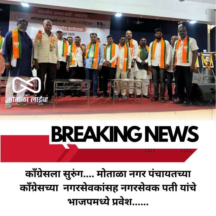 ( मोताळा लाईव्ह) मोताळा नगरपंचायत च्या काँग्रेसच्या 6 नगरसेवकांचा आज दिनांक 3 जून 2025 रोजी नागपूर येथे भाजपमध्ये जाहीर प्रवेश केला असून त्यामध्ये काँग्रेसचे असलेले विद्यमान नगरसेवक ..शेख शहनाज बी शेख सलीम .शेख तसलीम शेख सलीम. नगरसेवक पुत्र संदीप वानखेडे माजी नगरसेवक तथा नगरसेवक पती विजय सुरळकर नगरसेवक पती कैलास भाऊ खर्चे नगरसेवक पती आसिफ कुरेशी. इत्यादी नगरसेवकांचा भाजपमध्ये जाहीर प्रवेश झाला असून काही दिवसा अगोदरच विजयराज शिंदे यांनी स्पष्ट केले होते की बुलढाणा जिल्हा भाजपमय करणार त्याची सुरुवात त्यांनी केली असून मोताळा येथील असलेले काँग्रेसचे सहा नगरसेवकांसह नगरसेवक पती भाजपमध्ये जाहीर प्रवेश केला असून त्यामध्ये आता मोताळा नगरपंचायत मध्ये भाजपची नगरसेवक संख्याही सध्या तरी शून्या वरून वाढ झाली असून त्यामुळे जिल्हाध्यक्ष विजयराज शिंदे यांनी काही दिवसा अगोदर माध्यमांशी बोलताना सांगितले होते की बुलढाणा जिल्हा आम्ही भाजप नाही करणार याचीच पाळमुळे रवण्यास विजयराज शिंदे यांनी सुरुवात केली आहे …..