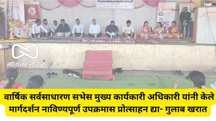 [मोताळा लाईव्ह ] उमेद महाराष्ट्र राज्य ग्रामीण जीवनोन्नती अभियान अंतर्गत तालुका अभियान व्यवस्थापन कक्ष बुलढाणा येथील हिरकणी महिला प्रभागसंघ रायपूरची “वार्षिक सर्वसाधारण सभा” ग्रामपंचायत माळवंडी येथे आज दि. 5 जून रोजी घेण्यात आली. या सभेला मुख्य कार्यकारी अधिकारी गुलाब खरात यांनी विविध विषयावर मार्गदर्शन करुन नाविण्यपूर्ण उपक्रम तसेच गावात उपलब्ध नसलेल्या व्यवसायांवर भर देण्याचे आवाहन केले.