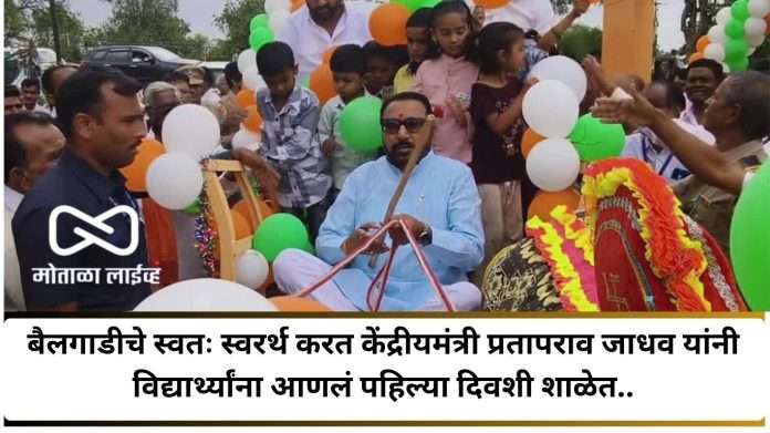 [मोताळा लाईव्ह ] पहील्या दिवशी शाळेत येणाऱ्या विद्यार्थ्यांना बैलगाडीतून बसून त्यांच स्वतःह स्वरर्थ करत केंद्रीयमंत्री प्रतापराव जाधव यांनी शाळेत आणलं शाळेत आलेल्या सर्व विद्यार्थ्यांना पुष्पगुच्छ देत त्यांचं स्वागत केलंदोन महिन्याच्या प्रदीर्घ सुट्टीनंतर विदर्भातील शाळेची पहिली घंटा आज 23 जूनला वाजली शाळेत येणाऱ्या प्रत्येक विद्यार्थ्यांचे स्वागत केंद्रीयमंत्री प्रतापराव जाधव यांनी मादणी येथील जिल्हा परिषद शाळेत जाऊन शाळा प्रवेशोत्सव कार्यक्रमाला हजेरी लावली विद्यार्थ्यांना पुष्पगुच्छ देऊन त्यांचे स्वागत केलं गावातून प्रवेशोत्सव दंडी वाजत गाजत करण्यात आली बैलगाडीतून विद्यार्थ्यांना घेऊन त्यांचे स्वरर्थ स्वतःह केंद्रीयमंत्री प्रतापराव जाधव यांनी केले शाळेत झालेल्या प्रवेशोत्सव कार्यक्रमात विद्यार्थ्यांना अद्यावत स्कूल बॅग आणि शालेय गणवेश विद्यार्थ्यांना देण्यात आले … केंद्रीय मंत्री प्रतापराव जाधव यांच्या पुढाकारातून बुलढाणा जिल्ह्यातील जिल्हा परिषद शाळेमध्ये शिकणाऱ्या जवळपास 17000 विद्यार्थ्यांना या अद्यावत स्कूल बॅग वाटप करण्यात येणार आहे त्याचा शुभारंभ आज जिल्हा परिषदेच्या मादणी शाळेपासून करण्यात आला..शिक्षणाविषयी विद्यार्थ्यांमध्ये गोडी निर्माण व्हावी आणि ग्रामीण भागातील विद्यार्थ्यांना सुद्धा चांगल्या दर्जेदार शैक्षणिक साहित्य मिळावे हेतुने ग्रामीण भागात शिक्षण घेणाऱ्या जिल्हा परिषदेच्या शाळेतील विद्यार्थ्यांसाठी या स्कूल बॅग वाटप करण्यात येत आहे …