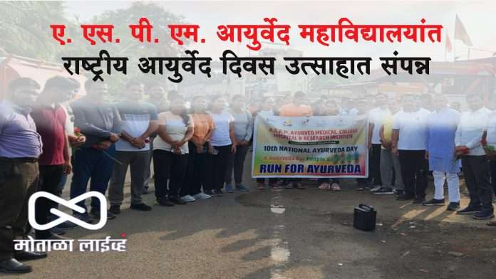 Motala live : संपूर्ण भारतभर मोठया उत्सहात साजरा होणाऱ्या १० व्या राष्ट्रीय आयुर्वेद दिनानिमित्त स्थानिक अजिंठा रोडस्थित ए. एस. पी. एम.आयुर्वेद महाविद्यालय बुलडाणाच्या वतीने विविध स्तुत्य उपक्रमांचे नियोजनबद्द आयोजन करण्यात आले होते. सदर उपक्रमांतर्गत बुलडाणा शहरांतील धाड नाका चौक परिसरापासून अजिंठा रोडस्थित ए. एस. पि. एम. आयुर्वेद महाविद्यालय प्रांगणापर्यंत आयुर्वेद शास्र्याच्या प्रचार व प्रसाराकरिता ‘रन फॉर आयुर्वेद’ अंतर्गत भव्य मॅरेथॉन स्पर्धा संपन्न झाली यावेळी संस्थेचे संस्थापक अध्यक्ष डॉ. राजेंद्र वाघ, उपाध्यक्ष मधुकरराव जायभाये, सचिव पंजाबराव इलग, कोषाध्यक्ष व प्राचार्य डॉ. राजेश्वर उबरहंडे, सहसचिव ऍड. पराग वाघ, मराठी पत्रकार संघाचे राज्य उपाध्यक्ष तथा भाजपचे जिल्हा उपाध्यक्ष चंद्रकांत बर्दे, तालुकाध्यक्ष सतीश भाकरे पाटील, शहराध्यक्ष मंदार बाहेकर, ऍड. मोहन पवार, अनंता शिंदे, प्राध्यापक वृंद व विद्यार्थी स्पर्धकांच्या उपस्थितीत यशस्वीतेरित्या संपन्न झाली. राष्ट्रीय आयुर्वेद दिनानिमित्त दुपारच्या सत्रात महाविद्यालयाच्या सांस्कृतिक सभागृहात विविध उपक्रमांचे आयोजन करण्यात आले होते यांमध्ये आयुष आहार पद्धतीच्या अप्रतिम अश्या विविध पदार्थांचा समावेश असलेल्या भव्य प्रदर्शनीचे यशस्वी आयोजन करण्यात आले होते. सदर कार्यक्रमाला प्रमुख अतिथी म्हणून शहरातील निमाचे प्रदेश पदाधिकारी डॉ. अजय खर्चे व डॉ. प्रशांत ढोरे यांची प्रमुख उपस्थिती होती. सदर कार्यक्रमांत देशातील महत्वाच्या समजल्या जाणाऱ्या भारतीय तटरक्षक दलात सहाय्यक कमांडंट व भारतीय लष्करात लेफ्टनंटपद प्राप्त करून मातृतीर्थ बुलढाणा जिल्ह्याचे नांव अभिमानाने उंचावणारे अनिकेत पवार यांच्या दैदीप्यमान दुहेरी यशाबद्दल मान्यवरांच्या शुभहस्ते सत्कार करण्यात आला. यावेळी विविध स्पर्धेतील प्रविण्यप्राप्त स्पर्धाकांना उपस्थित अतिथिंच्या हस्ते पुरस्कार देऊन सन्मानीत करण्यात आले. यावेळी संस्थेचे अध्यक्ष डॉ. राजेंद्र वाघ, उपाध्यक्ष मधुकरराव जायभाये, सचिव पंजाबराव इलग, आरोग्य विज्ञान विद्यापीठाचे सिनेट सदस्य तथा संस्थेचे कोषाध्यक्ष प्राचार्य डॉ. राजेश्वर उबरहंडे, संस्थेच्या संचालिका डॉ. स्वाती उबरहंडे, संचालक विजय जायभाये, कार्यक्रम समन्वयक सर्वस्वी डॉ. विवेक राजपूत, डॉ. प्रियांका चिंचोले व डॉ, दिपीका व्यवहारे तसेच महाविद्यालयाचे प्राध्यापक वृन्द डॉ. प्रवीण पाटील, डॉ. स्वप्नील धोरण, डॉ. कांचन अंभोरे, डॉ. अरुण देशमुख, डॉ.संजय ठोकळ, डॉ.सुनिल नागरे डॉ.वैशाली पेड्डावाड, डॉ.राजीव बुधवत, डॉ.संदिपकुमार नागरे, डॉ. देवयानी खेळकर, डॉ.गणेश देशमुख, डॉ. भागवत वसे, डॉ.वर्षा सरसांडे, डॉ.दिपीका 