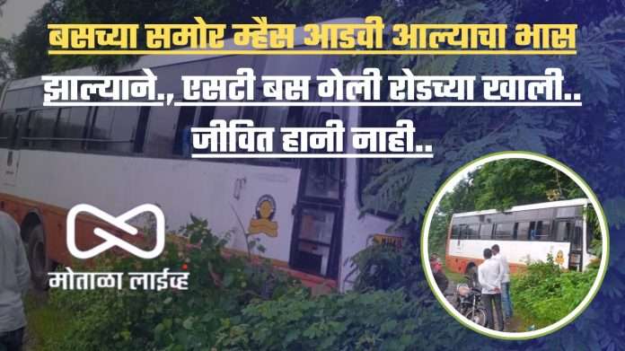 मोताळा लाईव्ह : मोताळा ते बुलढाणा रोडवरील पराग पेट्रोल पंपाच्या जवळ बुलढाणा वरून जळगाव जामोद कडे जाणारी बस क्र MH-40-N-9489 चे चालक अमजित आमद तडवी वय 39 वर्ष यांना बस समोर म्हैस आडवी आल्याचा भास झाल्याने सदर भरधाव बस ही रस्त्याच्या खाली गेली .या बस मध्ये 19 प्रवासी होते सदर या अपघातामध्ये मात्र एकाही प्रवाशाला दुखापत झाली नाही किंवा जखमी झाले नाही मात्र म्हैस आडवी आल्याचा भात झाल्याचा मुळे हा अपघात झाल्याचा चालक घ्यायला सांगितले आहे…