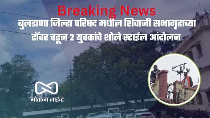 Home महाराष्ट्र अपडेट बुलडाणा जिल्हा परिषद मधील शिवाजी सभागृहाच्या टॉवर चढून 2 युवकांचे शोले स्टाईल...