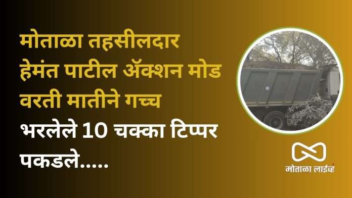 ( मोताळा लाईव्ह )बुलढाणा जिल्ह्यातील मोताळा तालुक्यात आज तहसीलदार हेमंत पाटील यांनी केली मोठी कारवाई, मोताळ्याचे तहसीलदार हेमंत पाटील हे ॲक्शन मोड वरती दिसून येत आहेत..मातीने गच्च भरलेले 10 चक्का टिप्पर क्रमांक MH 28BB 7663  पकडले, या टिपर मध्ये सिगोसाठ माती भरल्याने रस्त्याने माती चालताना सुद्धा ती माती खाली पडत होती एवढेच काय ही माती पाठीमागे चालणाऱ्या वाहनचालकाच्या डोळ्यांमध्ये सुद्धा या मातीचे कण जात होते, याबाबत हेमंत पाटील यांनी या ट्रिपला पकडले असून तहसील कार्यालयात जमा केले आहे याबाबत आता प्रादेशिक परिवहन बुलढाणा यांना याबाबतची माहिती देणार असल्याचे तहसीलदार यांनी सांगितले आहे…..तर मोताळा तालुक्यात मोठ्या अवैध उत्तखन होत असून त्यासाठी मोताळा तहसील हेमंत पाटील हे त्यांना लगाम लावणार अशा सुद्धा प्रश पडत आहे