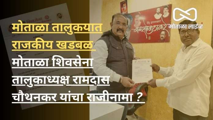 (मोताळा लाईव्ह ) मोताळा शिवसेना (शिंदे गट) तालुका अध्यक्ष रामदास चौथनकर यांनी आपला पदाचा राजीनामा दिला असून त्यामुळे मोताळा तालुक्यात राजकीय खडबळ झाली असून रामदास चौथनकर यांनी का राजीनामा दिला आहे ? याबाबत एकच चर्चा सुरु आहे मात्र या बाबत विचारणा केली असता माझा वयक्तिक कारणामुळे मी राजीनामा दिला असून संघटेने साठी मी वेळ देहू शकणार नाही त्यामुळे राजीनामा दिला गेलया ८ वर्षा पासून मी या पदावर असून गेलाय २२ वर्षा पासून मी शिवसेना या पक्षात एकनिष्ठ असून मला पक्षाने पंचायत समिती सदस्य , मन सन्मान दिला आहे मी मोताळा तालुका अध्यक्ष पदाचा राजीनामा हा जिल्हा प्रमुख ओम सिंग राजपूत यांच्याकडे दिला आहे तर आता मोताळा तालुकाअध्यक्ष यांची धुरा कोणाच्या खांद्यावर दिली जाते यांची याकडे सर्वांचे लक्ष लागून आहे