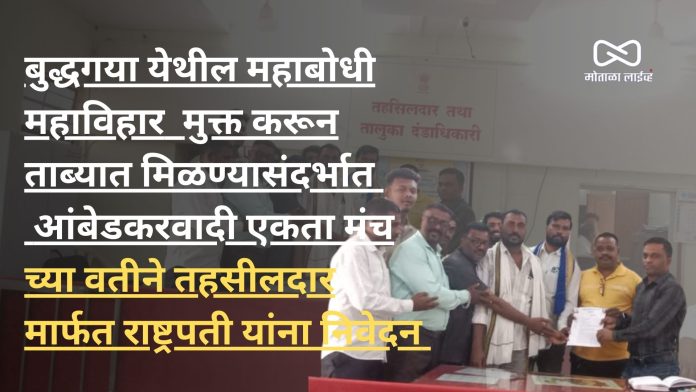 करिता आम्ही सेवेशी विनम्र निवेदन सादर करतो की, महाबोधी बुध्दविहार बुद्धगया विनाविलंब बौध्दांच्या ताब्यात देण्यात यावे.व त्यांच्या सर्व मागण्या मंजूर करण्यात यावे यासाठी मोताळा तहसीलमार्फत राष्ट्रपती यांना निवेदन देण्यात आले त्यावेळीविजय दोडे सतीश नरवाडे गजानन अहिरे राजूभाऊ गायकवाड राजेंद्र सावळे अजाबराव अहिरे अमोल तेलंग संदीप धुरंदर मंगेश सुरडकर शिवाजी तायडे पद्माकर सरकटे रोहन महाले हुसेन खा मोहम्मद खा आदी उपस्थित होते