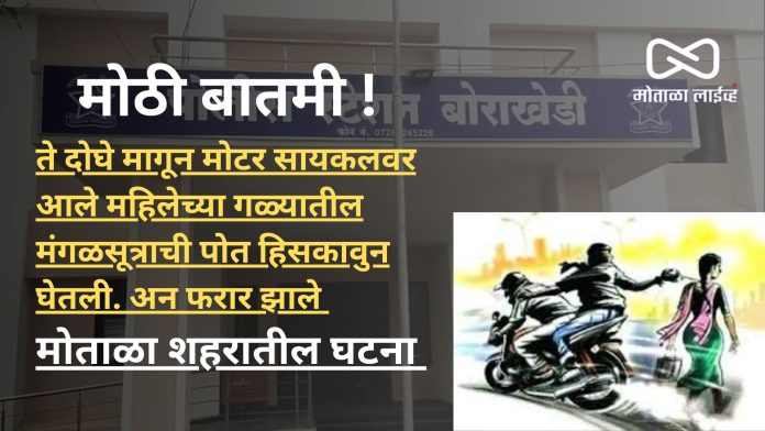 ते दोघे मागून मोटर सायकलवर आले महिलेच्या गळ्यातील मंगळसूत्राची पोत हिसकावुन घेतली. अन फरार झाले ,मोताळा शहरातील घटना