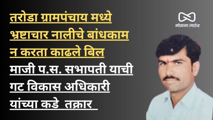 [मोताळा लाईव्ह] मोताळा तालुक्यातील तरोडा ग्रामपंचायत मध्ये झालेल्या भ्रष्टाचाराची चौकशी करा माजी प.स सभापती याची गट विकास अधिकारी यांच्या कडे लेखी तक्रार केली असून तरोडा येथील ग्रामपंचायतचे सचिव व सरपंच यांनी १५ वा वित्त आयोगामधील रक्कमेचा अपहार केला असून नालीचे बांधकाम न करता ९४,०००/- रुपयांचे बिल काढले आहेत हे बिले जि.एस.टी कपात न करता काढले असून .तसेच १५ वा वित्त आयोगाचे कामे ग्रा.पं. सदस्यांना विश्वासात न घेता व आराखडा नुसार कामे न करता बिले काढली असून .याबाबत सर्व कामाची सखोल चौकशी करुन कार्यवाही करण्यात यावी. तसेच यापुढे आराखडयानुसार होत नसलेल्या कामाची बिले देण्यात येऊ नये. अशा प्रकारची लेखी तक्रार मोताळा पंचायत समितीचे माजी सभापती प्रकाश गण्यानसिंग बस्सी यांनी केली आहे
