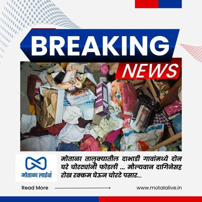 मोताळा तालुक्यातील दाभाडी येथील विष्णू पांडुरंग टेकाळे हे आपल्या पत्नीसह राहतात मलकापूर ते दाभाडी रस्तावर त्यांचे घर असून काल रात्रीच्या सुमारास ते आपल्या घराच्या अंगणातच झोपले होते सकाळी उठून पाहता तर त्यांच्या घरातील सर्वसामान अस्ताव्यस्त पडलेले होते व घरातील असलेले सोन्याचे मौल्यवान दागिने चोरले त्यांना निदर्शनास आले तर दुसरीकडे त्याच घरापासून काही अंतरावर असलेले किशोर पंढरी तळोले त्यांच्या घरात सुद्धा या ठिकाणी चोरी झाली असून त्यांच्या घरातील असलेले रोख रक्कम अंदाजे 50 ते 60 हजार रुपये घेऊन चोरटे पसार झाले आहे या घटनेमुळे दाभाडी परिसरामध्ये एकच खळबळ उडाली असून नागरिकांमध्ये भीतीचे वातावरण निर्माण झाले आहे. घटनास्थळी बोरखेळी पोलीस दाखल झाले आहे