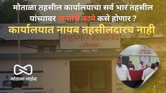 [ मोताळा लाईव्ह ] मोताळा तहसील कार्यालयामध्ये गेल्या अनेक दिवसापासून नायब तहसीलदार दिसून येत नाही तर त्यांच्या असलेल्या कॅबिन सुद्धा सध्या भंगार अवस्थेत पडलेला पाहायला मिळत नाही .. मोताळा तहसील कार्यालयामध्ये एकूण ४ नायब तहसीलदार पदे मंजूर आहेत मात्र या ठिकाणी सध्या एकही नाही नायब तहसीलदार पाहायला मिळत नाही तर गेल्या अनेक दिवसापासून या ठिकाणचे नायब तहसीलदार पद आहे रिक्त आहे त्यामुळे संपूर्ण कामाचा ताण हा सध्याचे असलेले तहसीलदार हेमंत पाटील यांच्यावर पडत असून अनेक नागरिकांच्या रोशाला त्यांना सामना करावा लागत आहे तर सध्या शैक्षणिक कामासाठी मोठ्या प्रमाणात विद्यार्थ्यांना दाखल्यांची आवश्यकता असते तसेच शेतीच्या कामासाठी सुद्धा अनेक शेतकऱ्यांना या ठिकाणी सातबारा, फेरफार ,अशा कागदपत्रांची आवश्यकता असते मात्र या ठिकाणी गेल्या काही दिवसापासून तहसीलदार हेमंत पाटील हे सर्व काम पाहत असून नायब तहसीलदार नसल्यामुळे अनेकांशी या ठिकाणी तहसीलदारांचे वाद विवाद सुद्धा पाहायला मिळाले आहे त्यामुळे मोताळा तहसील कार्यालयामध्ये लवकरात लवकर नायब तहसीलदार अशी मागणी आता जनतेकडून होत आहे