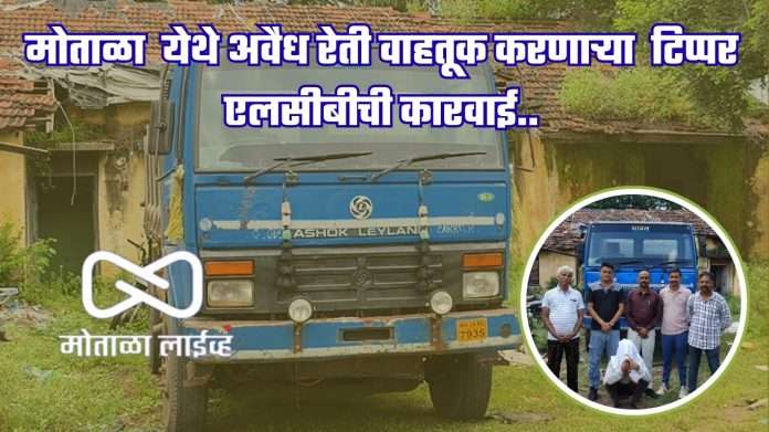 [मोताळा लाईव्ह] मोताळा तालुक्यात मोठ्या प्रमाणात अवैध रेती वाहतूक जोमात सुरू असून गेल्या काही दिवसापासून मोताळा शहरातून बुलढाणाकडे मोठ्या प्रमाणात अवैध  रेती वाहतूक होत असल्याचे पाहायला मिळत असून दि. 9 सप्टेंबर 2025 रोजी दुपारी १२ वाजेच्या सुमारास परडा फाट्यावरती नांदुरा वरून बुलडाण्या कडे जात असेलल्या अवैध रित्या रेती वाहतूक करणारे टिप्पर एलसीबीच्या पथकाने पकडले असून त्यामध्ये दोन ब्रास रेती मिळून असून अंदाजे किंमत वीस हजार रुपये एकूण मुद्दे माल1520,000/ रुपये जप्त करण्यात आला असून या टिप्परवरती विविध कलमावर बोराखडी पोलीस स्टेशन येथे गुन्हा दाखल करण्यात आला या कारवाई च्या पथकामधे HC जगदेव टेकाळेHC दिगंबर कपाटे PC दीपक वायाळpc निलेश राजपूत Pc राकेश नायडूचालक विकास देशमुख इत्यादींचा सहभाग होता