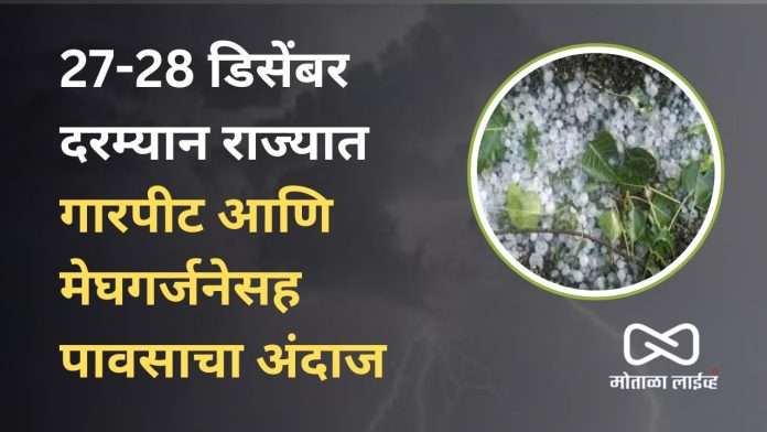 (मोताळा लाईव्ह ): 27-28 डिसेंबरदरम्यान मध्य महाराष्ट्र, मराठवाडा आणि विदर्भात गारपीट आणि मेघगर्जनेसह पावसाचा अंदाज वर्तविण्यात आला आहे.27 डिसेंबरला दुपारपासून मेघगर्जनेसह पावसाची सुरुवात सर्वात प्रथम नंदुरबार, धुळे, जळगाव, अहिल्यानगर जिल्ह्यांसह, दक्षिण मराठवाडा, पुणे आणि नाशिक जिल्ह्यांतील पूर्व भागांमध्ये होईल. शुक्रवार रात्रीपर्यंत वादळी पाऊस पश्चिम विदर्भ आणि शेजारच्या मराठवाड्यात हजेरी लावेल, ज्यात बुलढाणा, अकोला, वाशीम, अमरावती, छत्रपती संभाजीनगर, जालना, परभणी, हिंगोली आणि बीड जिल्ह्यांचा समावेश आहे. या भागांमध्ये काही प्रमाणात गारपिटीची शक्यता देखील वर्तविण्यात आली आहे. मध्य महाराष्ट्र आणि मराठवाड्याच्या उर्वरित जिल्ह्यांतील काही भागांमध्ये मेघगर्जनेसह पाऊस पडण्याची शक्यता देखील आहे.